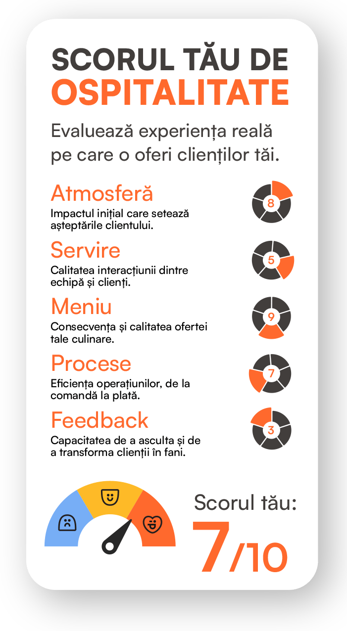 În era vitezei, un review negativ călătorește instant. Răspunde la întrebări și află scorul tău de ospitalitate. Vei primi instant o analiză a scorului tău și un plan de acțiuni concrete și relevante pentru tine pe care le poți implementa imediat, într-un raport pdf personalizat în funcție de răspunsurile tale, în mai puțin de 3 minute, direct pe e-mail.